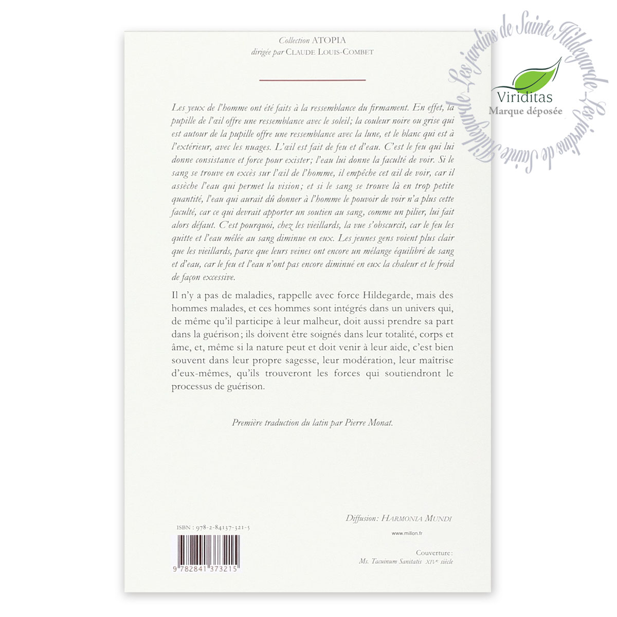Il n’y a pas de maladies, rappelle avec force Hildegarde, mais des hommes malades, et ces hommes sont intégrés dans un univers qui, de même qu’il participe à leur malheur, doit aussi prendre sa part dans la guérison ils doivent être soignés dans leur totalité, corps et âme, et, même si la nature peut et doit venir à leur aide, c’est bien souvent dans leur propre sagesse, leur modération, leur maîtrise d’eux-mêmes, qu’ils trouveront les forces qui soutiendront le processus de guérison.